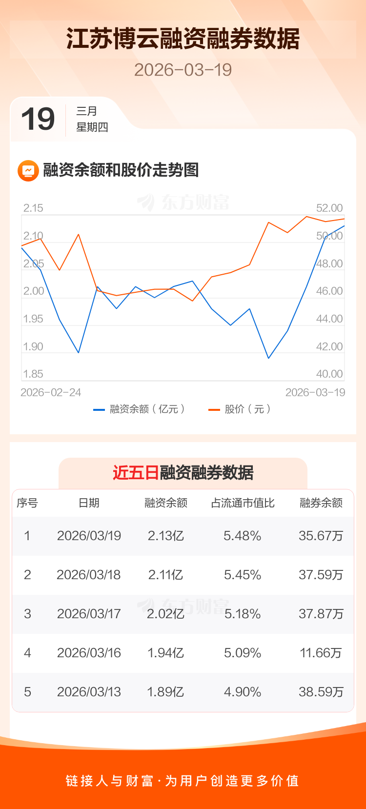 交易所最新数据显示,江苏博云于2026年3月19日获融资买入1238.72万元,融资偿还1065.86万元,当日融资净买入172.85万元。目前,该股融资余额2.13亿,占流通市值比例为5.48%。