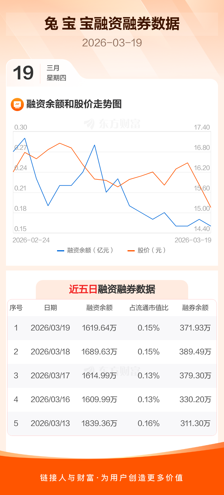 交易所最新数据显示,兔 宝 宝于2026年3月19日获融资买入328.99万元,融资偿还398.98万元,当日融资净偿还69.99万元。目前,该股融资余额1619.64万,占流通市值比例为0.15%。