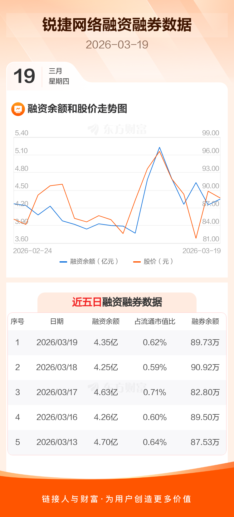 交易所最新数据显示,锐捷网络于2026年3月19日获融资买入6760.77万元,融资偿还5736.42万元,当日融资净买入1024.35万元。目前,该股融资余额4.35亿,占流通市值比例为0.62%。