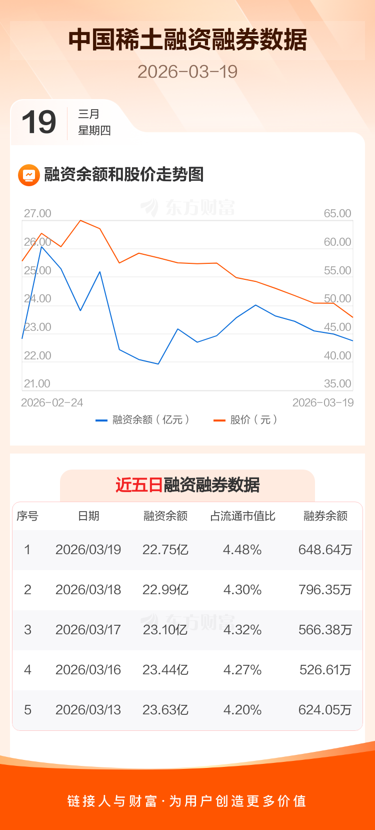 交易所最新数据显示,中国稀土于2026年3月19日获融资买入1.10亿元,融资偿还1.34亿元,当日融资净偿还2379.57万元。目前,该股融资余额22.75亿,占流通市值比例为4.48%。