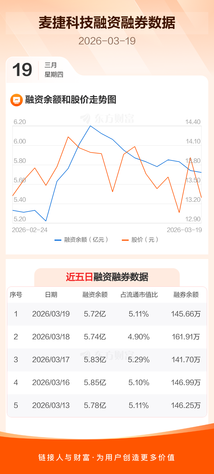 交易所最新数据显示,麦捷科技于2026年3月19日获融资买入6283.71万元,融资偿还6508.04万元,当日融资净偿还224.33万元。目前,该股融资余额5.72亿,占流通市值比例为5.11%。