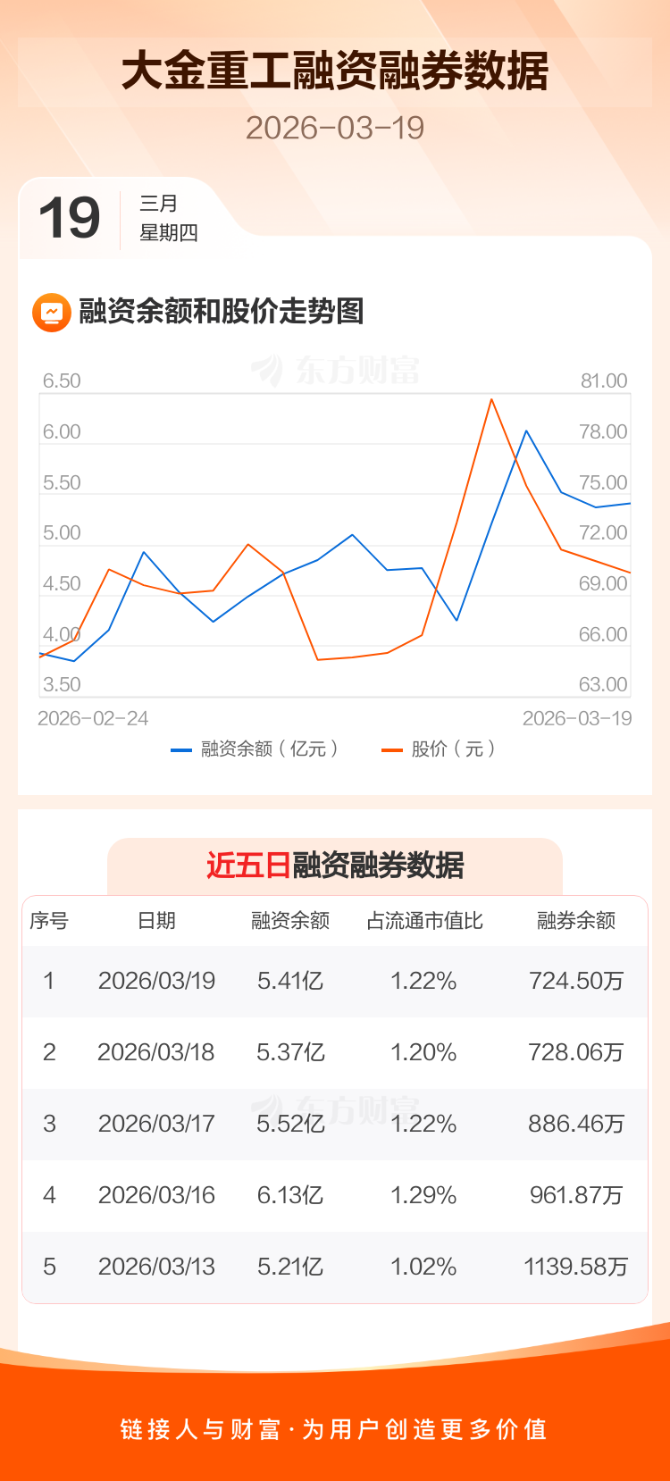 交易所最新数据显示,大金重工于2026年3月19日获融资买入1.19亿元,融资偿还1.15亿元,当日融资净买入427.6万元。目前,该股融资余额5.41亿,占流通市值比例为1.22%。