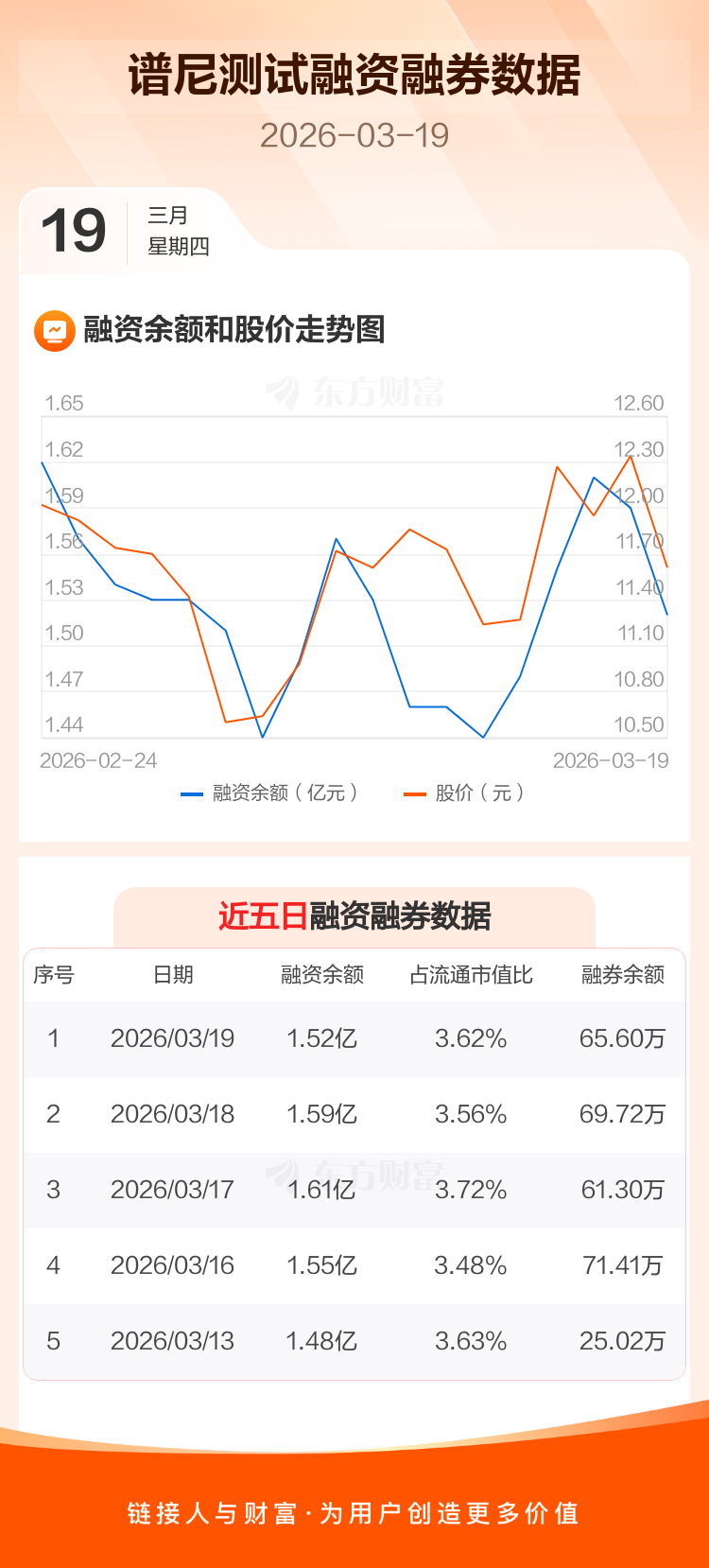 交易所最新数据显示,谱尼测试于2026年3月19日获融资买入2380.77万元,融资偿还3086.92万元,当日融资净偿还706.14万元。目前,该股融资余额1.52亿,占流通市值比例为3.62%。