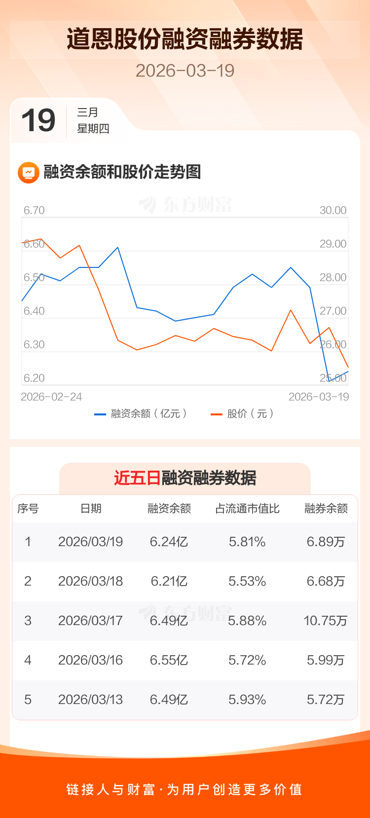 交易所最新数据显示,道恩股份于2026年3月19日获融资买入849.24万元,融资偿还564.84万元,当日融资净买入284.39万元。目前,该股融资余额6.24亿,占流通市值比例为5.81%。