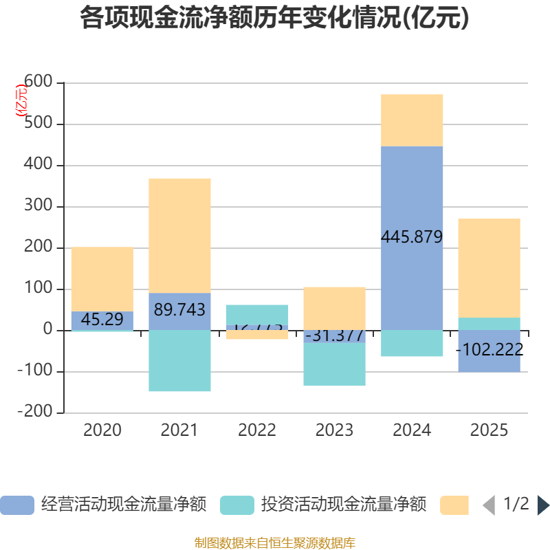 截至2025年,公司经营活动现金流净额为-102.22亿元,同比减少548.1亿元;筹资活动现金流净额240.13亿元,同比增加114.73亿元;投资活动现金流净额29.97亿元,上年同期为-63.92亿元。