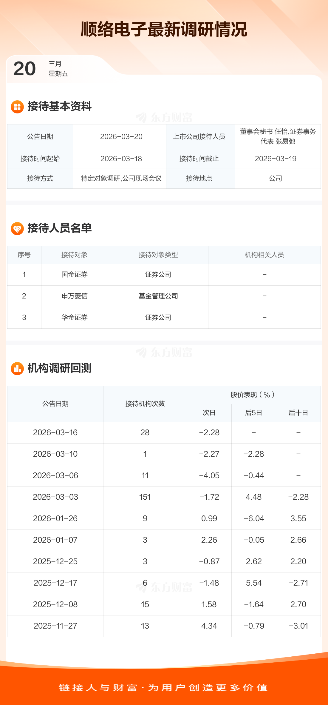 顺络电子3月20日公告称,3月18日至3月19日接待国金证券等3家机构调研。接待人员包括董事会秘书 任怡,证券事务代表 张易弛。