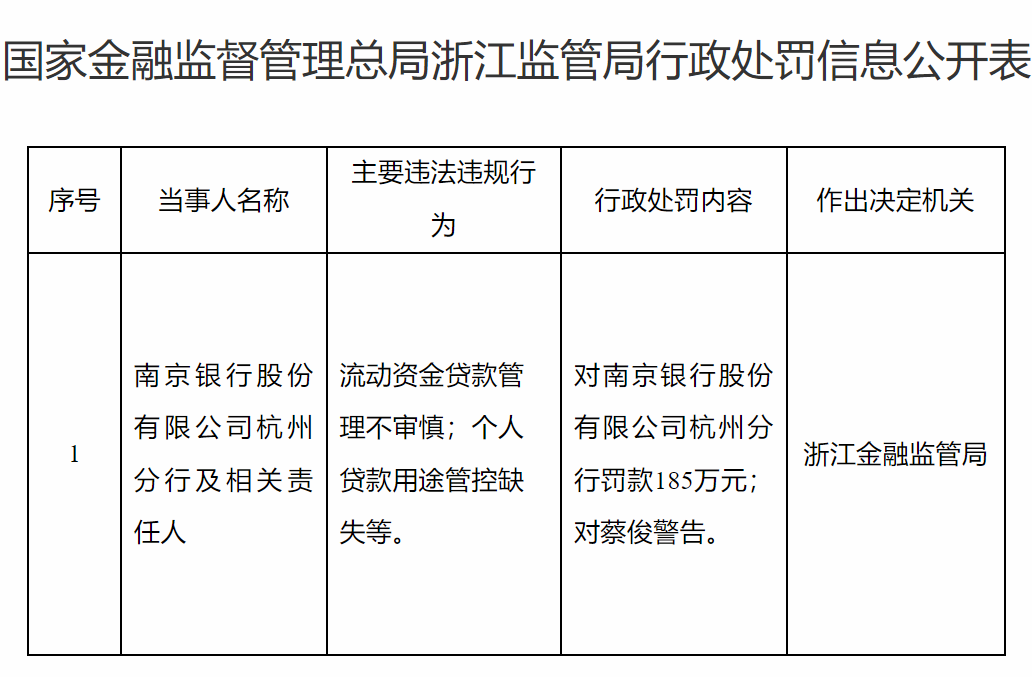 因存在个人贷款用途管控缺失等问题,南京银行领185万罚单