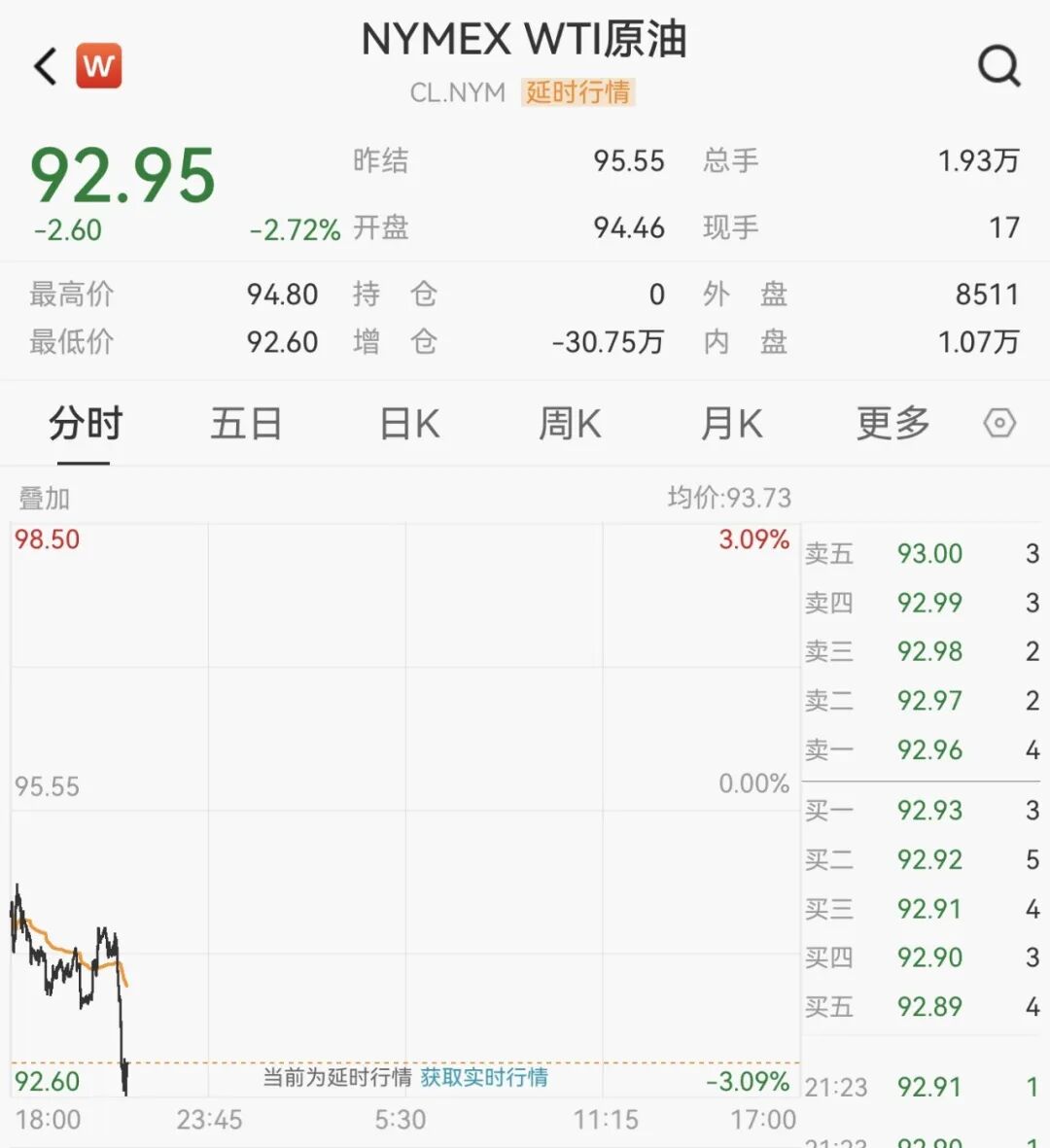 WTI原油期货跌幅扩大至2.7%,报92.95美元/桶。