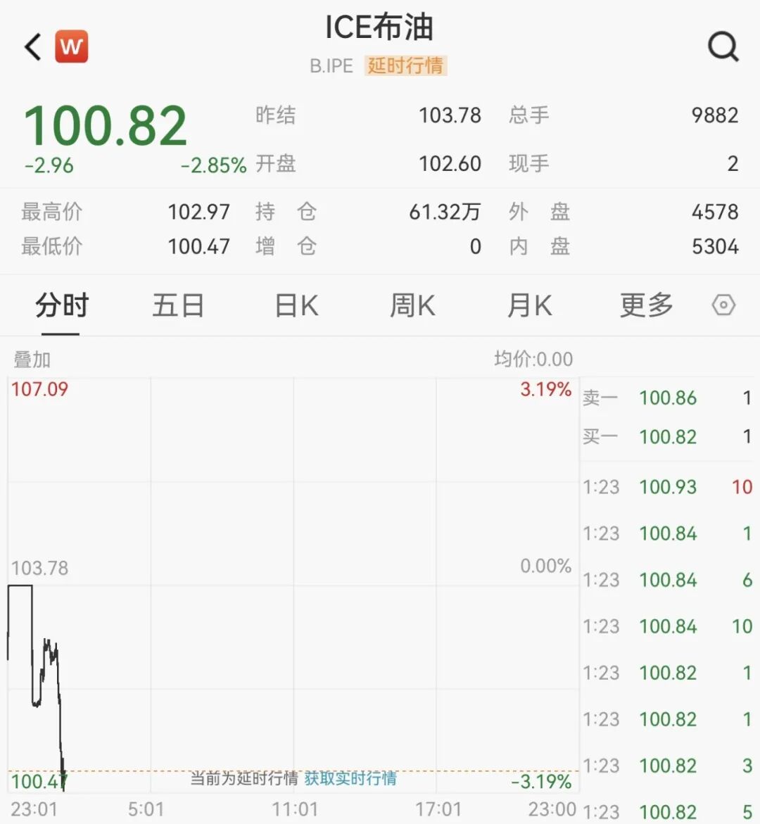 3月20日,亚市早盘原油期货快速走低,布伦特原油失守101美元/桶,日内跌2.85%。