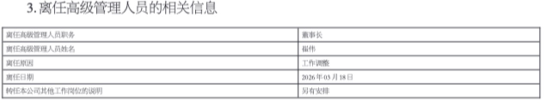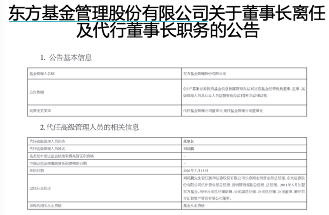 3月20日,东方基金发布高级管理人员变更公告称,经公司董事会审议通过,因工作调整,崔伟离任公司董事长一职,由总经理刘鸿鹏代为履行董事长职务。