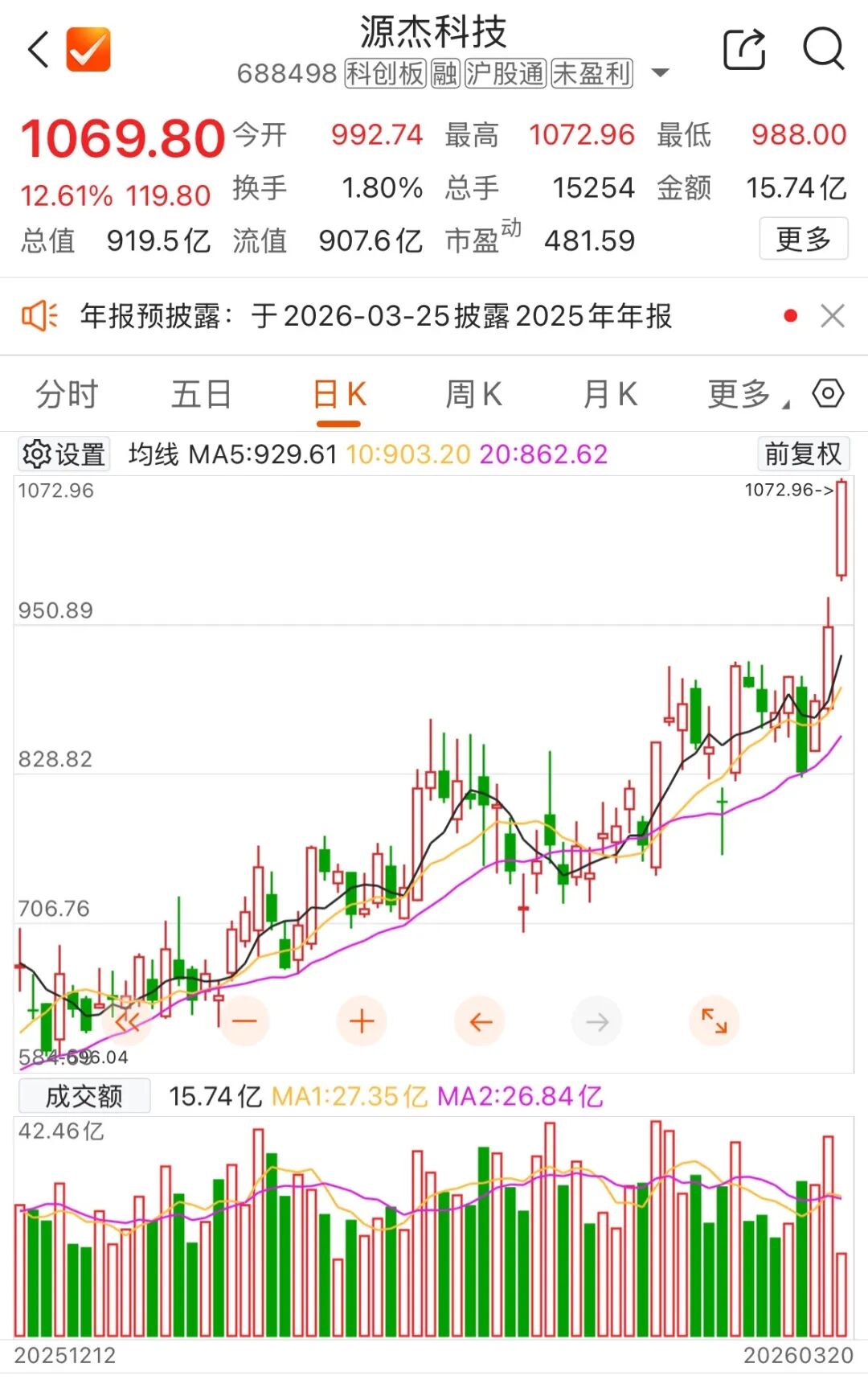 个股方面,源杰科技(688498)股价盘中突破1000元,截至发稿报1069.8元/股。