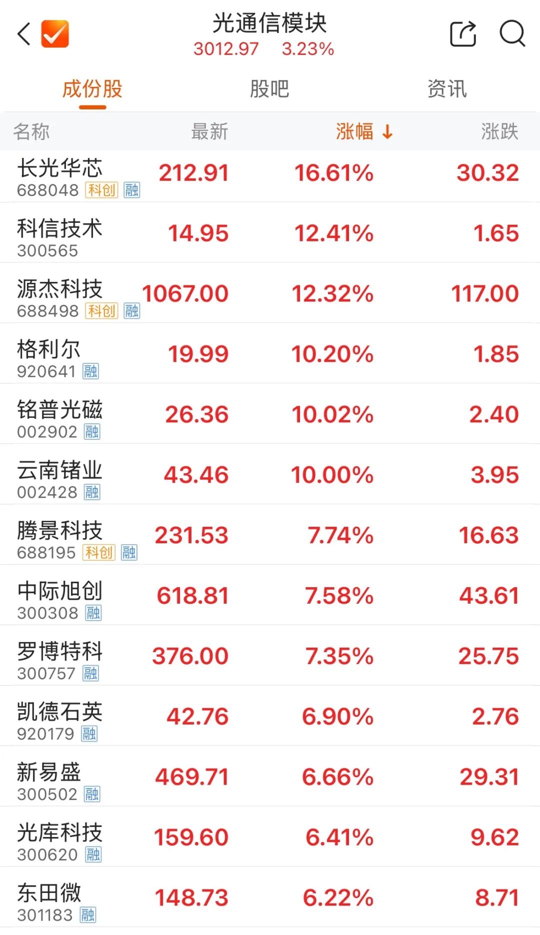 3月20日早盘,光通信板块开盘大涨,多只个股直线拉升。截至发稿,长光华芯涨超16%,科信技术、源杰科技涨超12%,铭普光磁、云南锗业等涨停。