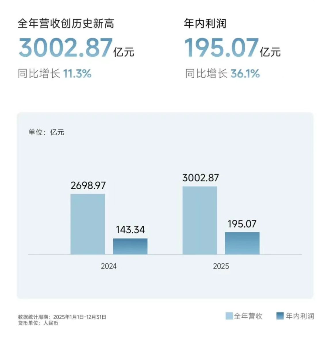 报告期内,奇瑞汽车实现收入3002.87亿元,同比增长11.3%;实现利润195.07亿元,同比增长36.1%;净利率由2024年的5.3%提升至6.5%。