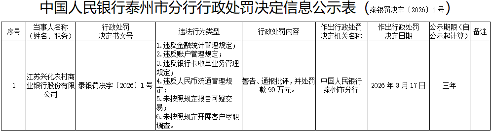 【大河财立方消息】3月19日,中国人民银行泰州市分行披露的行政处罚决定信息显示,因违反金融统计管理规定、违反账户管理规定、违反银行卡收单业务管理规定、违反人民币流通管理规定、未按照规定报告可疑交易、未按照规定开展客户尽职调查,江苏兴化农村商业银行被警告、通报批评,并处罚款99万元。