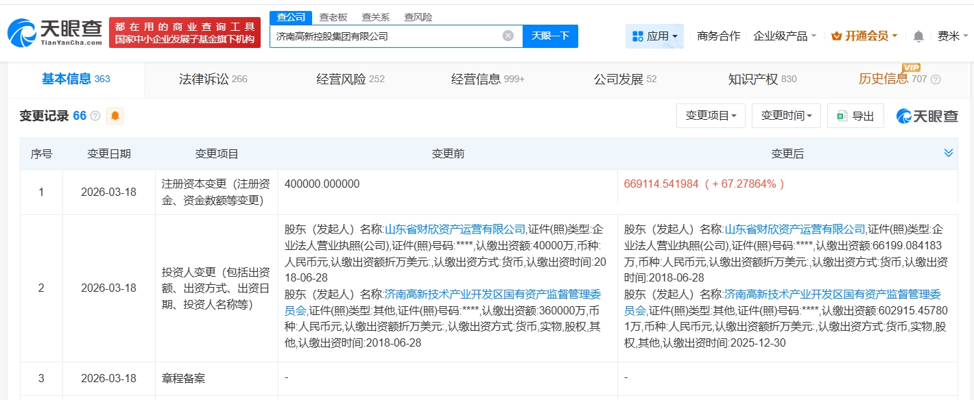 南方财经3月20日电,天眼查App显示,近日,济南高新控股集团有限公司发生工商变更,注册资本由40亿人民币增至约66.9亿人民币,增幅约67%。济南高新控股集团有限公司成立于2001年6月,法定代表人为李涛,经营范围包括房地产开发经营、建设工程施工、自有资金投资的资产管理服务等。股东信息显示,该公司由济南高新技术产业开发区管理委员会(济南综合保税区管理委员会)、山东省财欣资产运营有限公司共同持股。