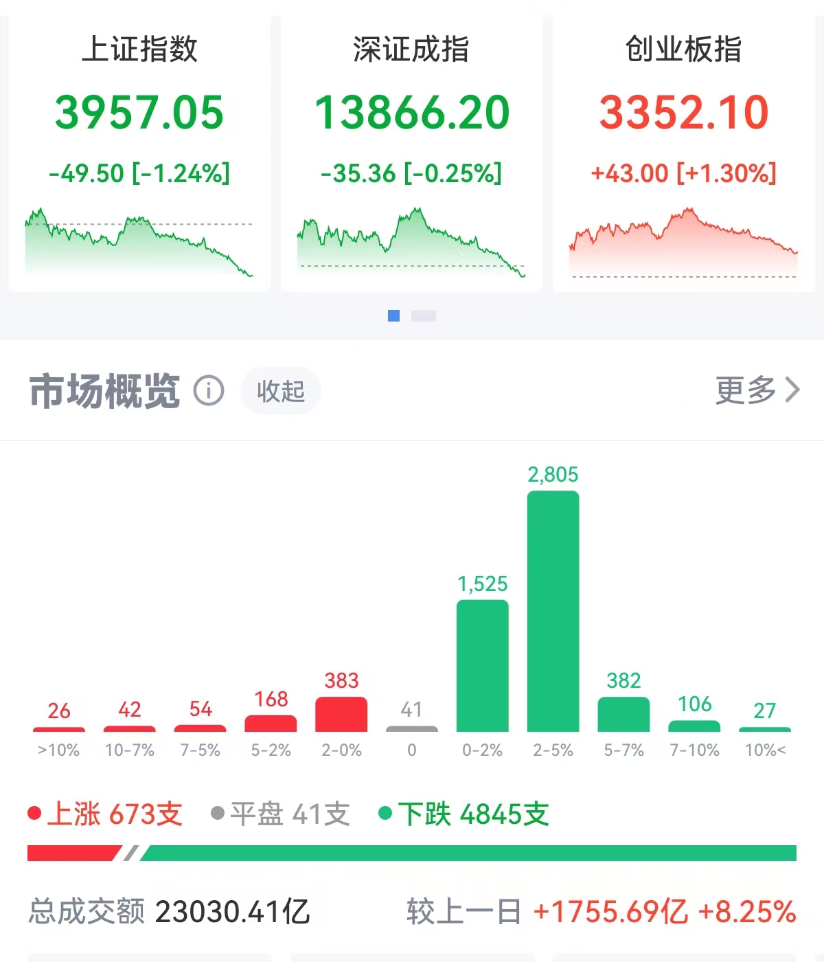 截至收盘,沪指跌1.24%,报3957.05点,创年内新低;深成指跌0.25%,报13866.20点;创业板指涨1.3%,报3352.10点。 市场逾4800股下跌。全天成交逾2.3万亿元,较上一个交易日放量1755亿元。