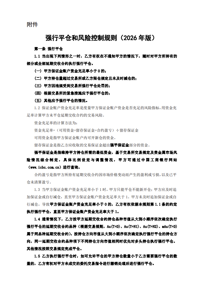 强平保证金比例暂按上海黄金交易所规定的最低交易保证金比例执行。后续,我行将根据市场情况与贵金属风险管理和业务需要,酌情对强平保证金比例进行调整。本公告自发布之日至2026年3月31日为公示期。公示期内,存量客户有异议的,可依据《代理个人客户贵金属竞价交易业务协议书》的约定解除代理关系。公示期满,存量客户未解除代理关系的,视为同意接受《强行平仓和风险控制规则(2026年版)》,客户与我行签订的《代理个人客户贵金属竞价交易业务协议书》项下的附件2《强行平仓和风险控制规则》同步废止。