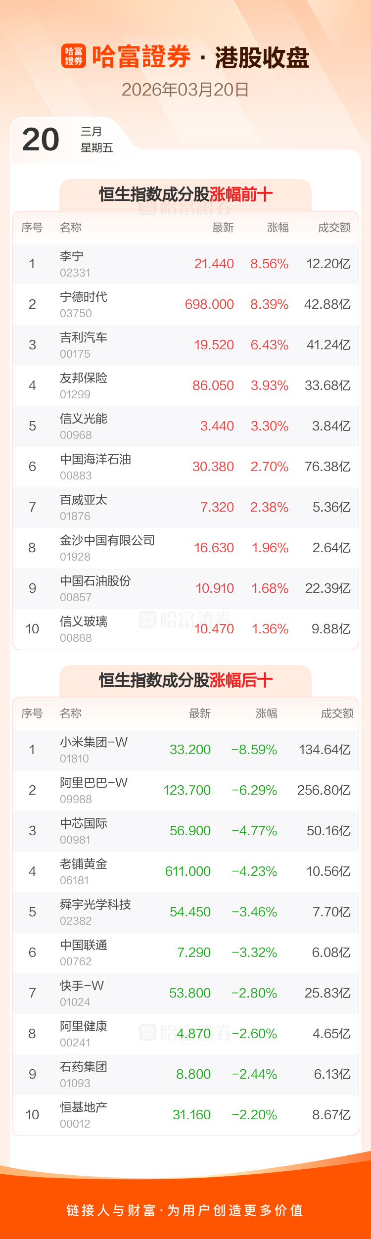 港股3月20日收盘走低 ,恒生指数收报25277.32点,跌223.26点,跌幅0.88%;恒生科技指数收报4872.38点,跌123.9点,跌幅2.48%。恒生指数成分股中李宁、宁德时代、吉利汽车涨幅居前,小米集团-W、阿里巴巴-W、中芯国际跌幅靠前。恒生科技指数成分股中地平线机器人-W、理想汽车-W、零跑汽车涨幅居前,小米集团-W、阿里巴巴-W、小鹏汽车-W跌幅靠前。