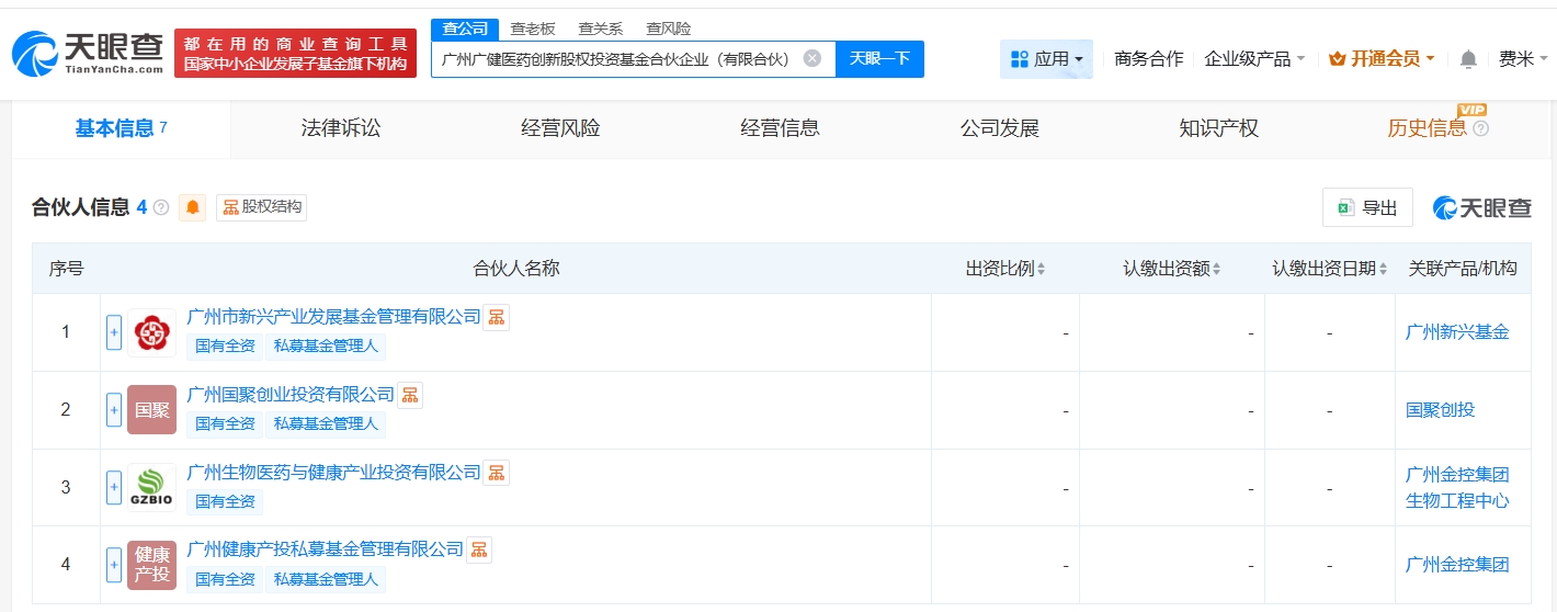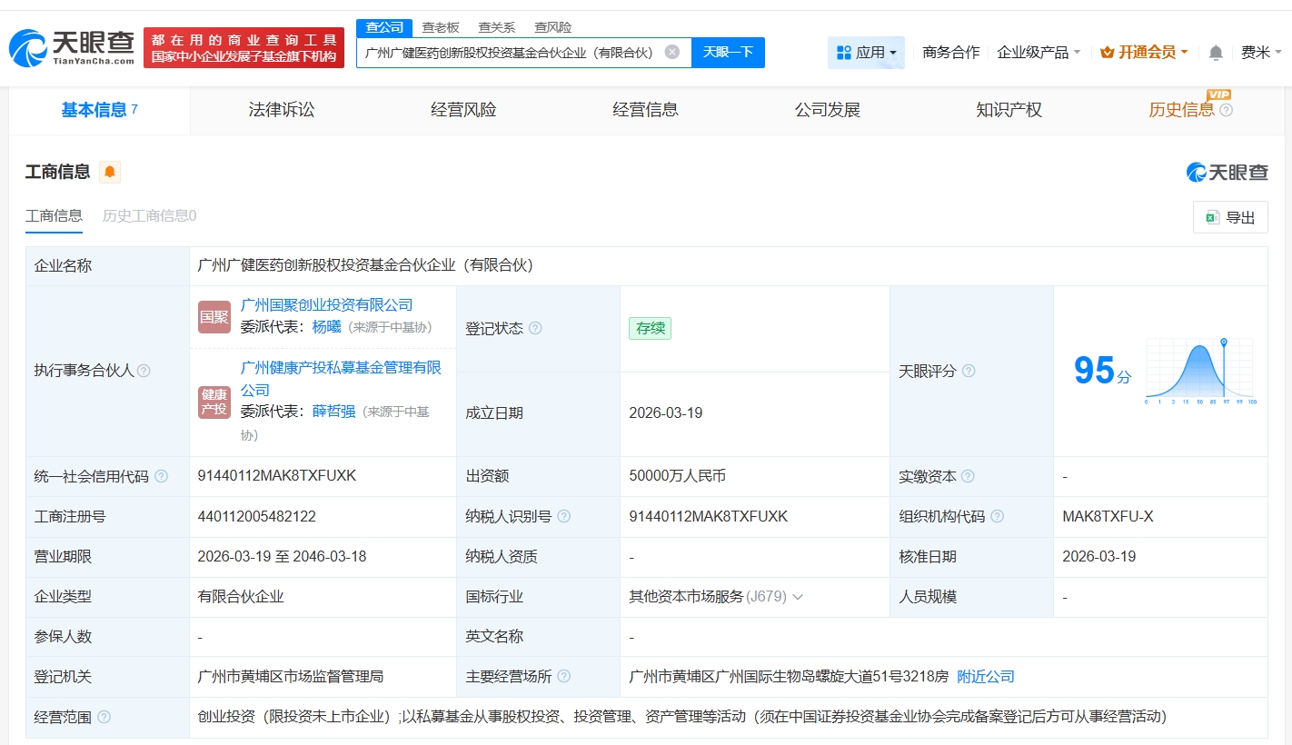 每经AI快讯,天眼查工商信息显示,近日,广州广健医药创新股权投资基金合伙企业(有限合伙)成立,执行事务合伙人为广州国聚创业投资有限公司、广州健康产投私募基金管理有限公司,出资额5亿元人民币,经营范围为创业投资,以私募基金从事股权投资、投资管理、资产管理等活动。合伙人信息显示,该基金由广州市新兴产业发展基金管理有限公司、广州国聚创业投资有限公司、广州生物医药与健康产业投资有限公司等共同出资。