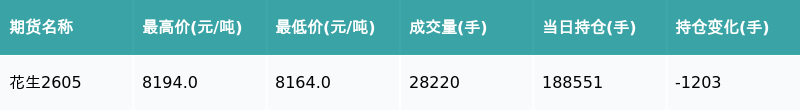 南财智讯3月20日电,盘后期货数据显示,郑州商品交易所的花生主力合约收跌0.15%,收盘报8188.0元/吨,日内资金流出689.51万元。其他相关指标见下表: