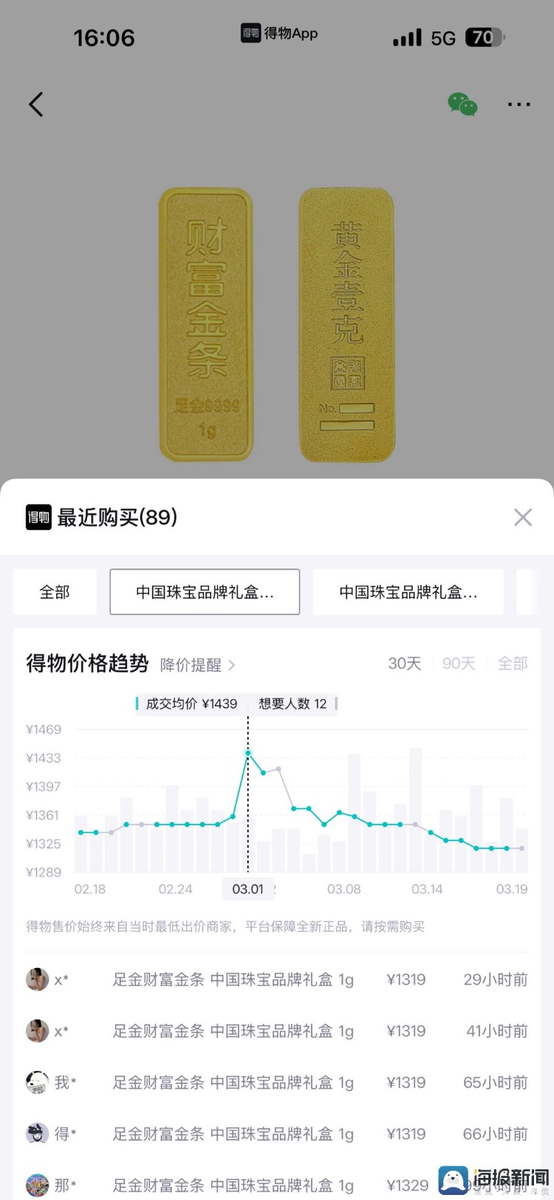 网络平台的金饰价格也迎来下跌趋势。得物App数据显示,截至3月19日,金饰、金条价格均较1个月前大幅下跌。其中,老凤祥足金碎碎冰戒指(0.7g)价格由1个月前的1037元下跌至1008元,下跌3%(29元),较最近1个月峰值的1080元下跌7%(72元)。