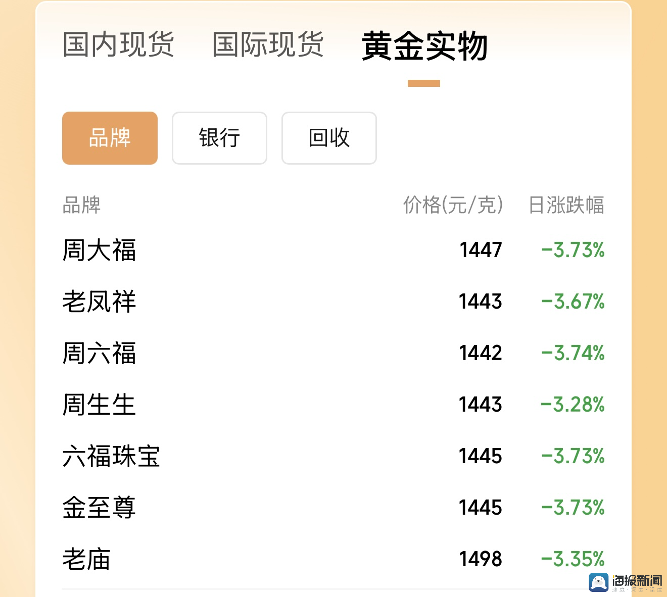 3月20日,国内金饰品牌价格持续下跌。