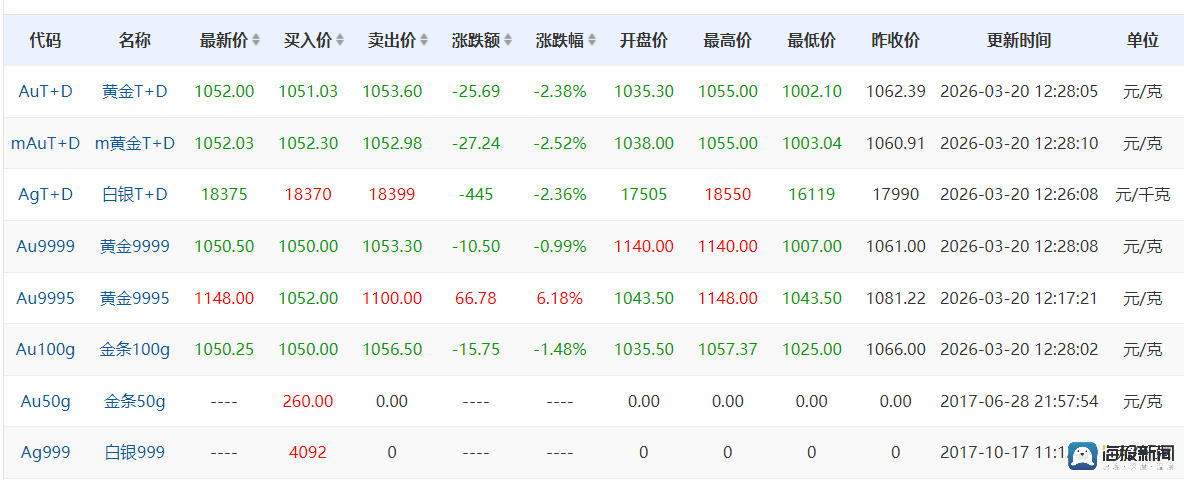 国内贵金属市场同步联动,呈现“跟跌”走势。上海黄金交易所数据显示,截至3月20日12时,黄金T+D报1052元/克,下跌25.69元,跌幅2.38%,盘中最低触及1002.1元/克,守住千元心理关口;白银T+D报18375元/千克,下跌445元,跌幅2.36%。整体跌幅较国际市场更为温和。