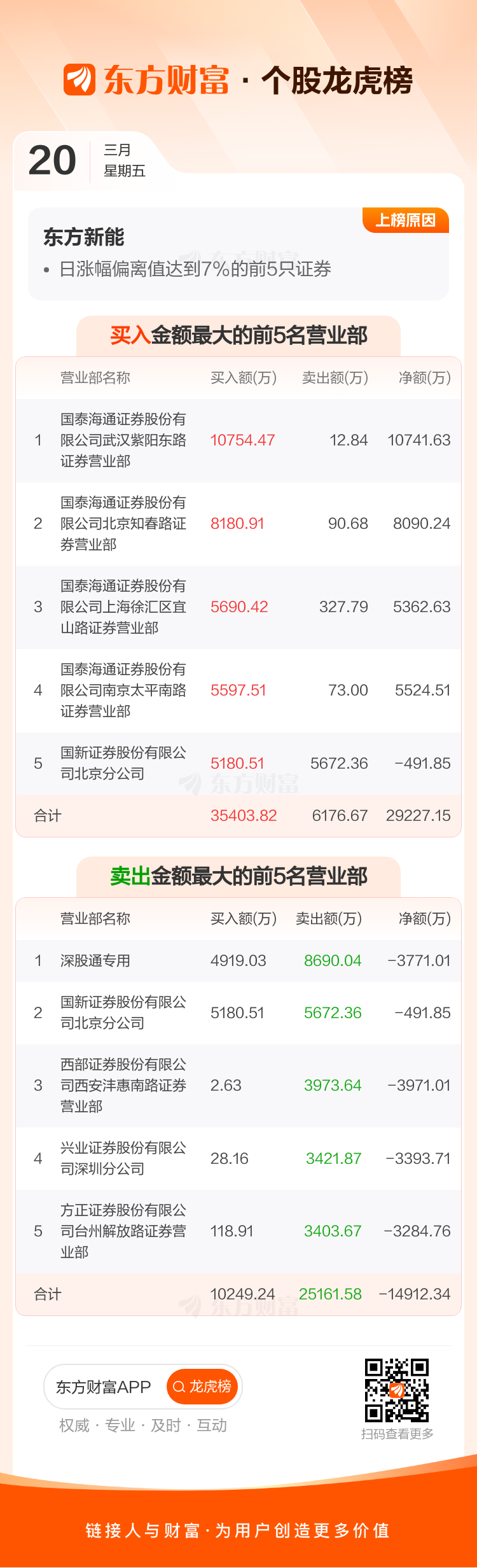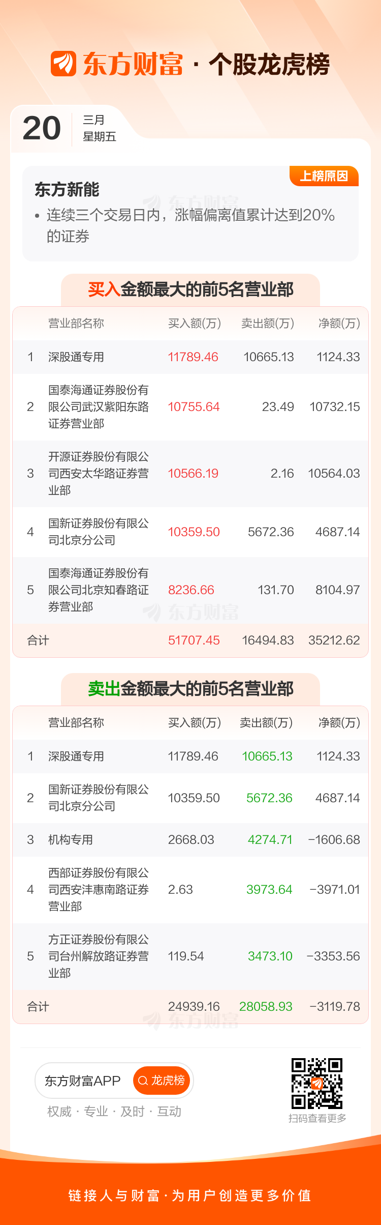 交易所2026年3月20日公布的交易公开信息显示,东方新能因成为日涨幅偏离值达到7%的前5只证券、连续三个交易日内,涨幅偏离值累计达到20%的证券上榜。东方新能当日收报3.48元,涨跌幅10.13%,偏离值11.18%,换手率18.28%,成交额26.29亿。异常期间3月19日至3月20日,期间涨幅21.25%,累计偏离值24.68%,区间成交额35.96亿。