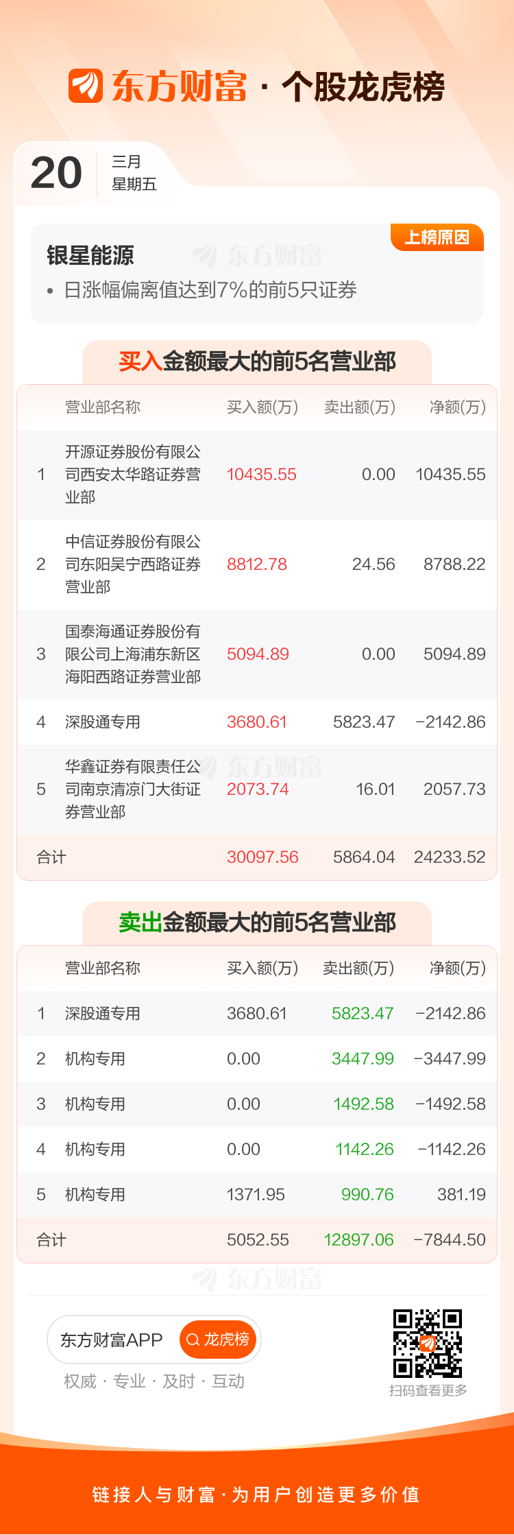 交易所2026年3月20日公布的交易公开信息显示,银星能源因成为日涨幅偏离值达到7%的前5只证券上榜。银星能源当日收报8.44元,涨跌幅10.04%,偏离值11.18%,换手率22.39%,成交额11.33亿。