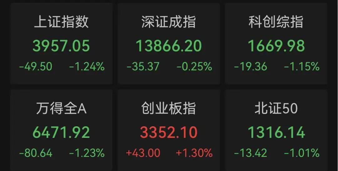 今天,A股市场冲高回落,上证指数跌破4000点整数关口,创业板指盘中创今年以来新高后涨幅收窄。截至收盘,上证指数跌1.24%,深证成指跌0.25%,创业板指涨1.3%,科创综指跌1.15%。