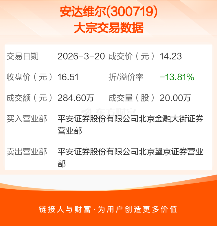 2026年3月20日,安达维尔发生1笔大宗交易,共成交20.00万股,成交金额284.60万元,占其流通市值比例为0.10%。