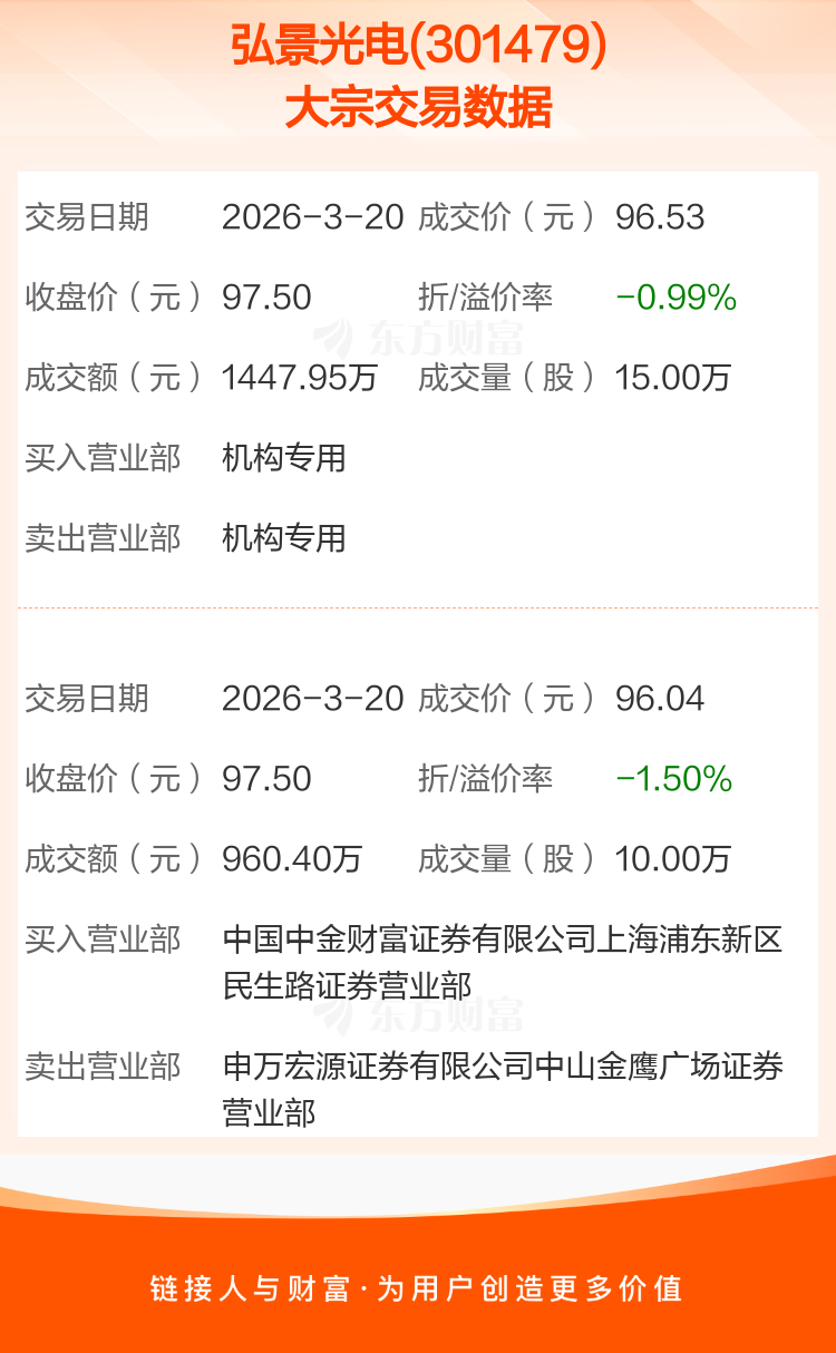 2026年3月20日,弘景光电发生2笔大宗交易,共成交25.00万股,成交金额2408.35万元,占其流通市值比例为0.49%。