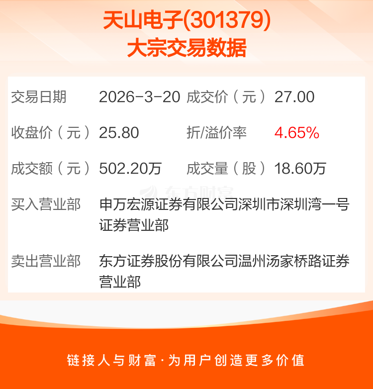 2026年3月20日,天山电子发生1笔大宗交易,共成交18.60万股,成交金额502.20万元,占其流通市值比例为0.15%。