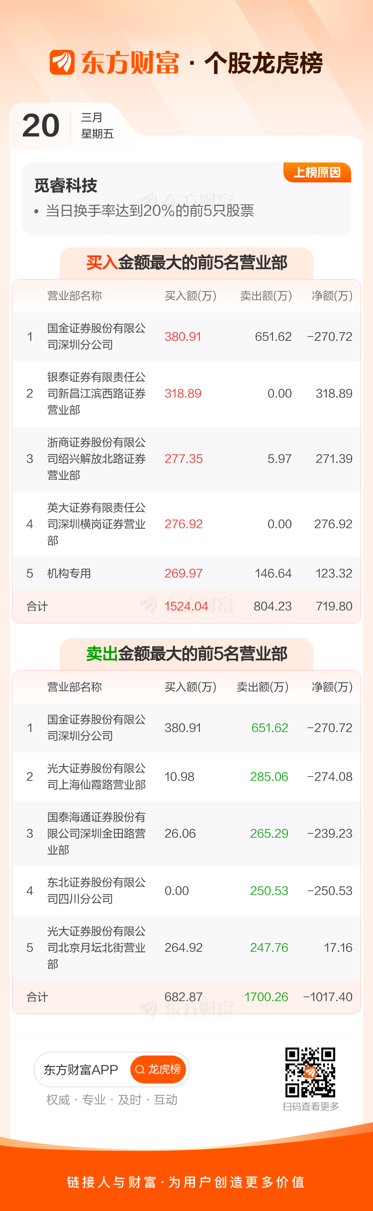 交易所2026年3月20日公布的交易公开信息显示,觅睿科技因成为当日换手率达到20%的前5只股票上榜。觅睿科技当日收报51.33元,涨跌幅-5.82%,偏离值26.72%,换手率26.72%,成交额1.83亿。