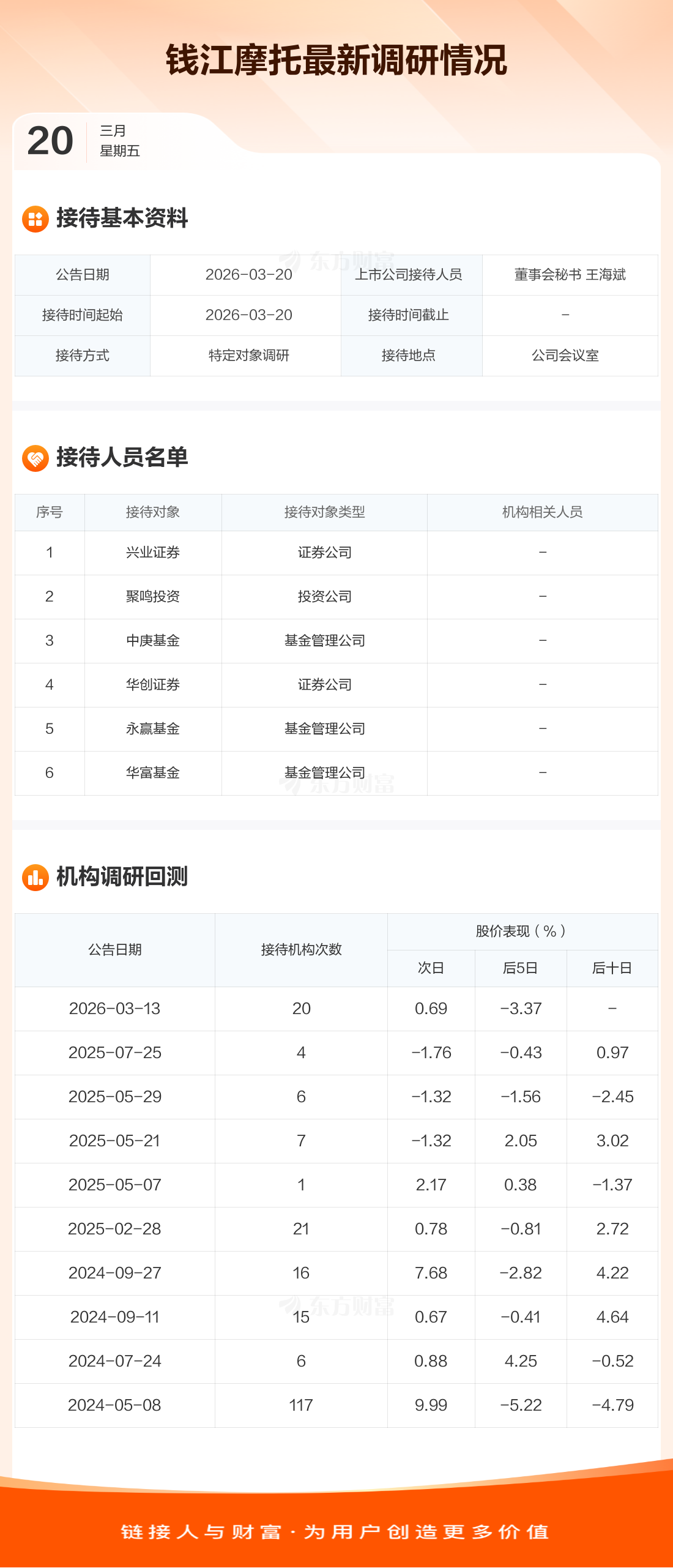 钱江摩托3月20日公告称,3月20日接待兴业证券等6家机构调研。接待人员包括董事会秘书 王海斌。