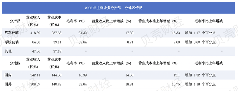 另一方面,海外业务成为关键增量。福耀玻璃2025年国内业务营收242.41亿元,同比增长14.58%;海外业务营收208.57亿元,同比增长18.81%,海外增速显著高于国内。