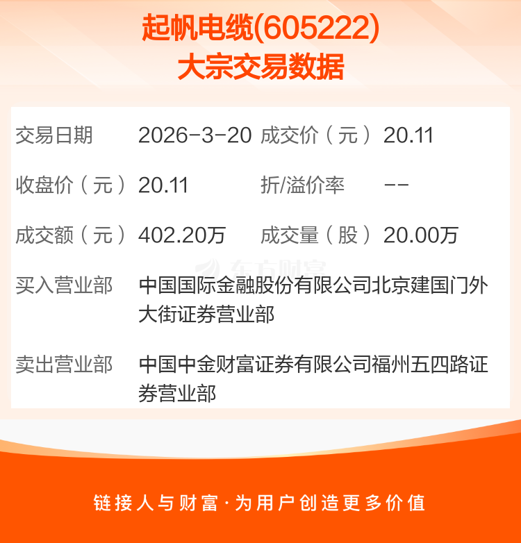 2026年3月20日,起帆电缆发生1笔大宗交易,共成交20.00万股,成交金额402.20万元,占其流通市值比例为0.05%。
