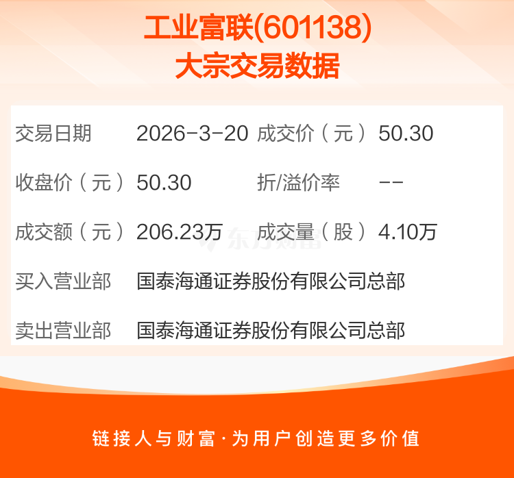 2026年3月20日,工业富联发生1笔大宗交易,共成交4.10万股,成交金额206.23万元。