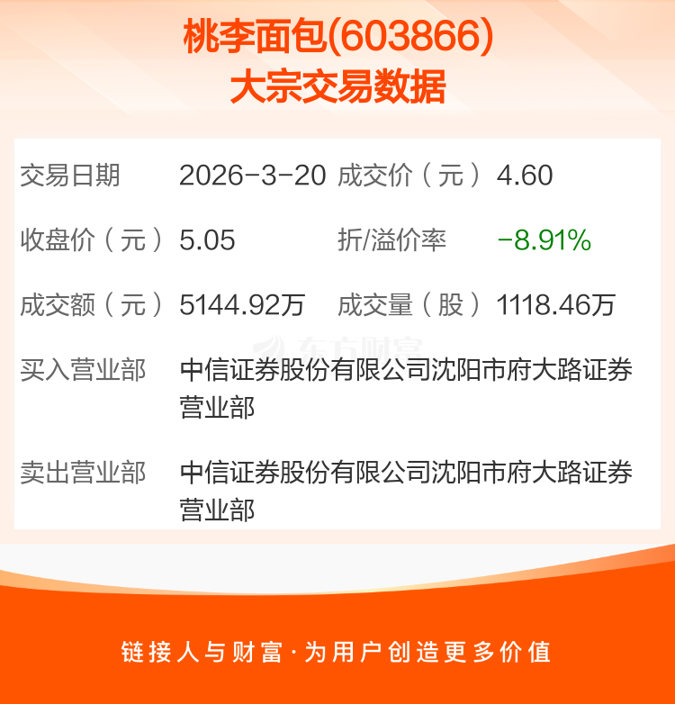 大宗交易:桃李面包成交5144.92万元,折价8.91%(3-20)