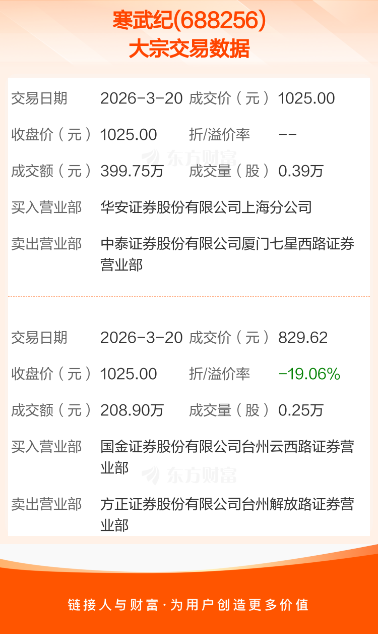 2026年3月20日,寒武纪发生2笔大宗交易,共成交6400股,成交金额608.65万元。