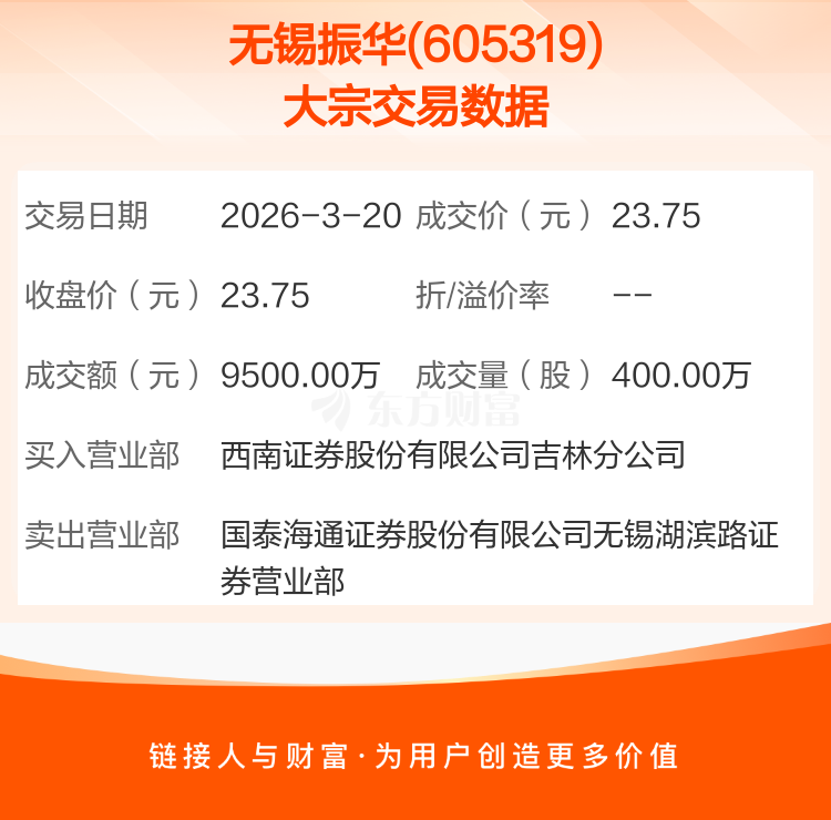 大宗交易:无锡振华成交9500.00万元(3-20)