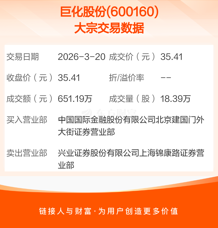 2026年3月20日,巨化股份发生1笔大宗交易,共成交18.39万股,成交金额651.19万元。