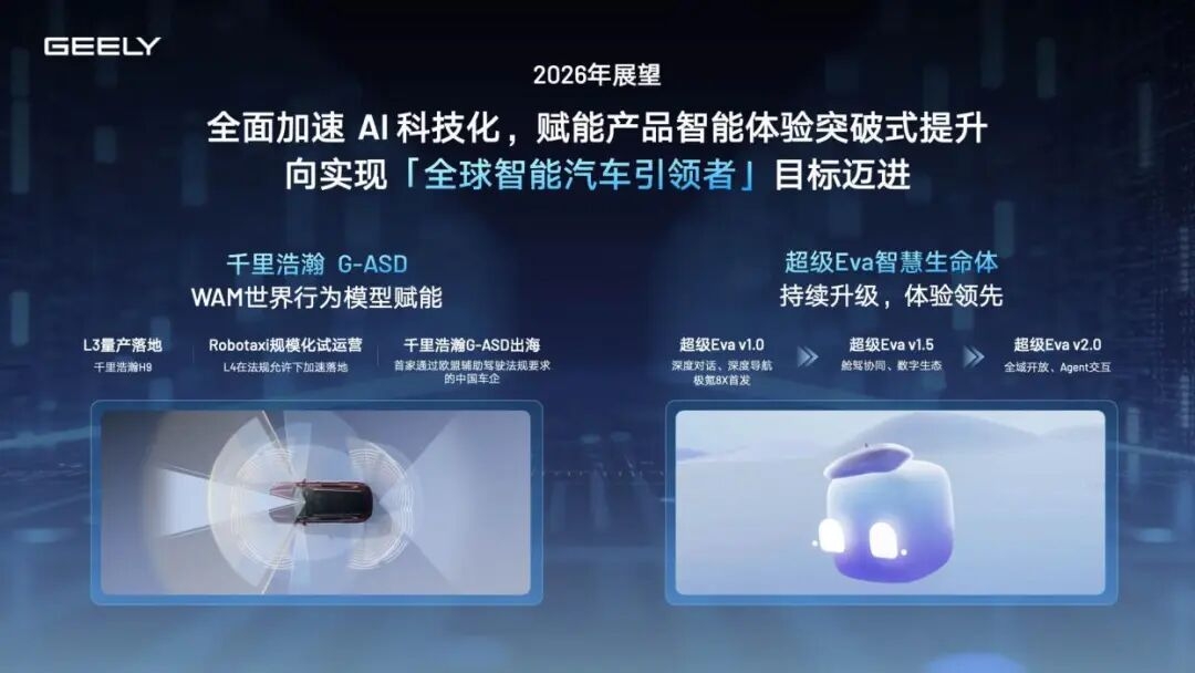 2025年,吉利的重心依旧在AI。2025年,吉利发布行业首个全域AI技术体系,将大模型融入整车研发、制造和交互全链路。到2026年1月,这一体系在CES上迭代至2.0版本,首发具备自我反思与进化能力的WAM世界行为模型,它可以模仿人类驾驶员的决策逻辑,并在行驶中持续修正。
