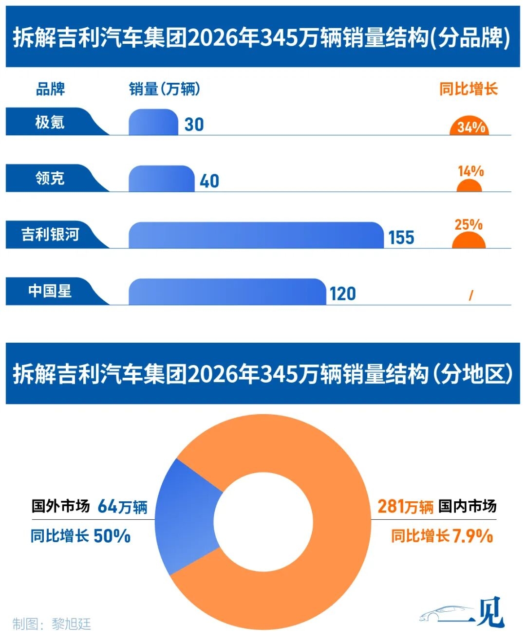 吉利计划继续以每天近万台的节奏竞速。2026年,吉利将销量目标锁定在345万辆,较2025年增长14%。2026年1月至2月,吉利汽车的销量47.63万辆,已经完成销量目标的13.8%。