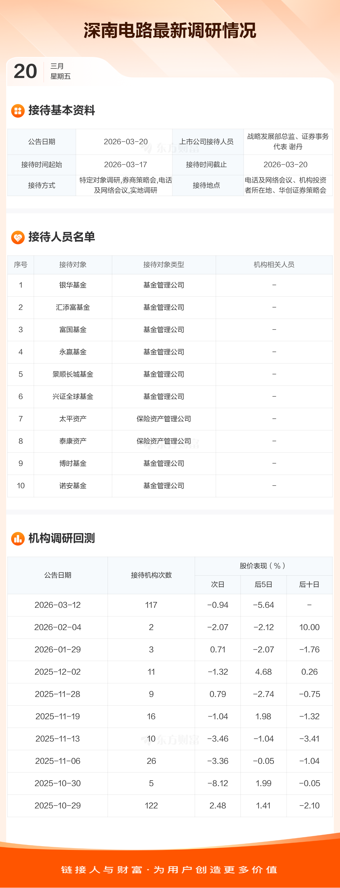 深南电路3月20日公告称,3月17日至3月20日接待银华基金等10家机构调研。接待人员包括战略发展部总监、证券事务代表 谢丹。