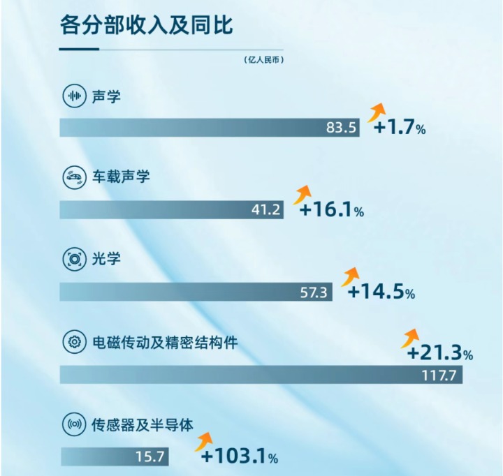 从财报可以看出,瑞声科技的业务结构与增长动力已经出现明显变化。传感器与半导体、电磁传动与精密结构件、光学业务的营收占比不断提升,成为业绩增长的重要来源。