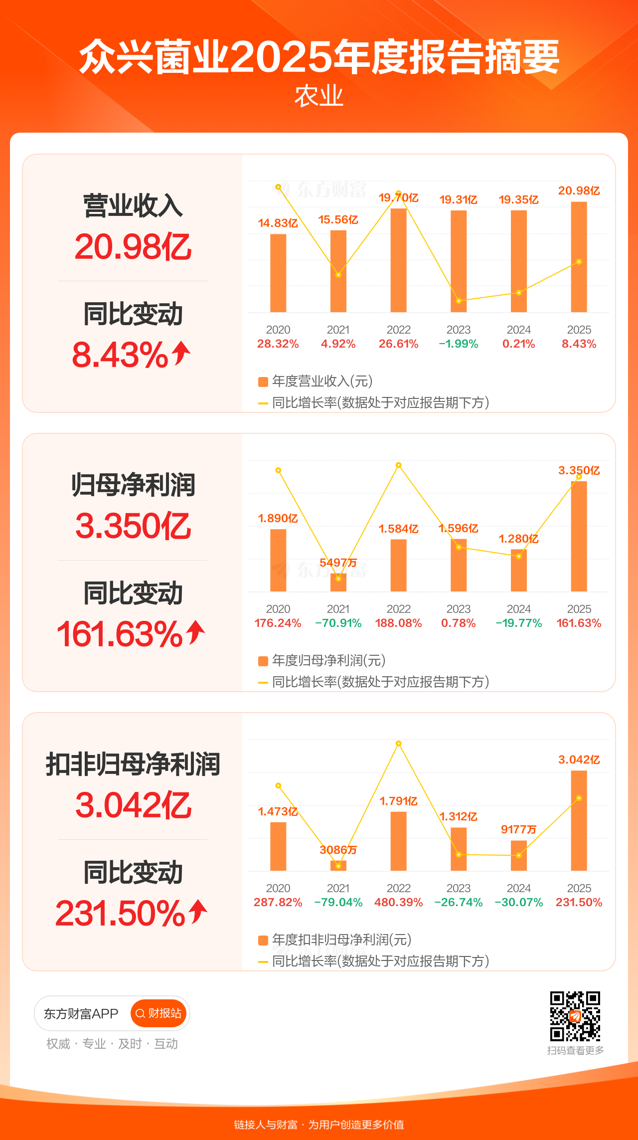 众兴菌业3月21日发布2025年年报显示,公司全年实现营业收入20.98亿元,同比增长8.43%;归母净利润3.35亿元,同比增长161.63%;扣非归母净利润3.04亿元,同比增长231.50%。每股EPS0.89元,低于机构一致预测的0.97元。