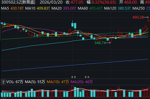 3月20日,A股光模块龙头新易盛(300502)股价强势拉升,截至收盘,涨幅达8.32%,报收477.05元,盘中一度触及490.28元的历史新高。