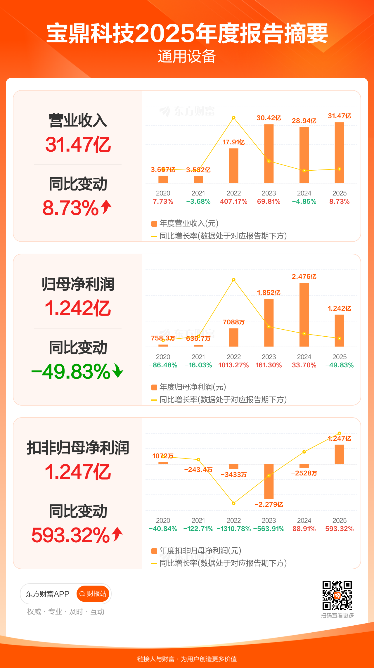 宝鼎科技3月21日发布2025年年报显示,公司全年实现营业收入31.47亿元,同比增长8.73%;归母净利润1.24亿元,同比下滑49.83%;扣非归母净利润1.25亿元,同比增长593.32%。