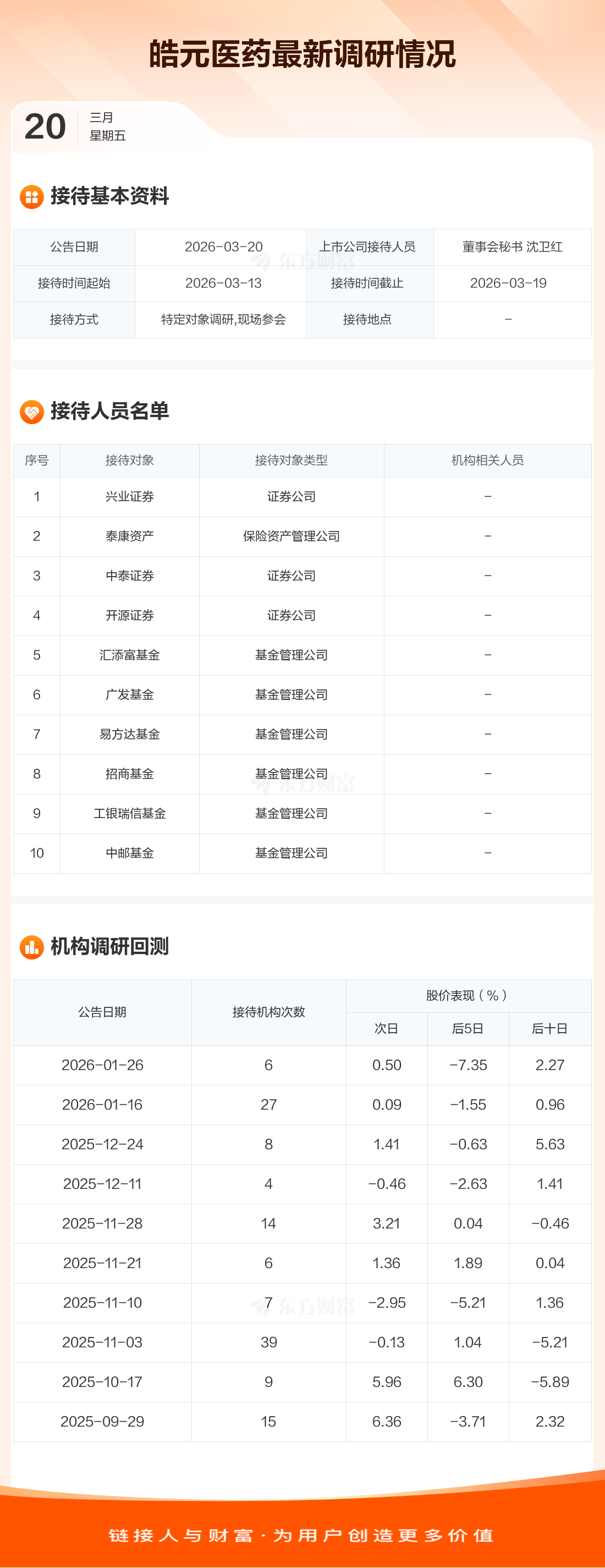 皓元医药3月20日公告称,3月13日至3月19日接待兴业证券等10家机构调研。接待人员包括董事会秘书 沈卫红。